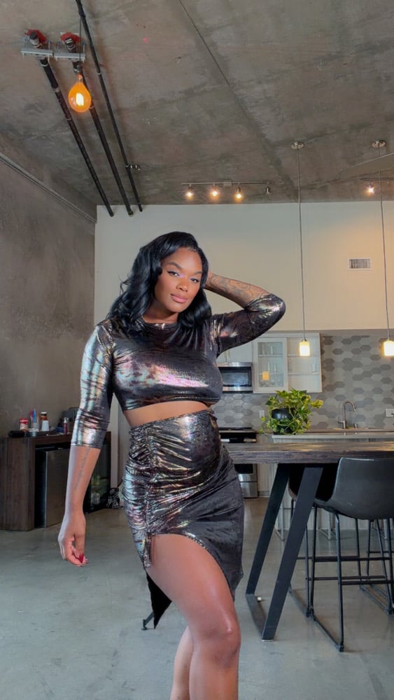 Happy new year!! New year, new me! We love anything that shimmers!! 2 colors available: silver and purple strips and silver and gold strips so pick what fits you best!! Scrunched skirt with adjustable side and a deep split! And a pretty crop top! Look out, new year here we come!