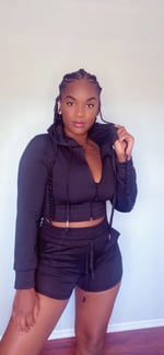 Treat me nicely… because I deserve it! This 2pc is so comfortable and cute. This crop top jacket comes with a hoodie and very soft material. The high waist shirts are stretchy and hug the curves . Top and bottom come with drawstring.