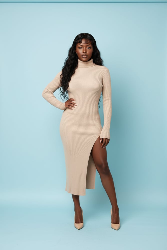 This sweater dress is for making heads turn!!! Soft fluffy sweater material that doesn’t itch! Turtle neck with long sleeves. And the main attraction is the thigh high split! Pair her with some thigh high boots and your ready to go